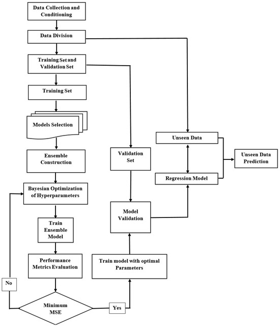Moreover, Bayesian optimization was applied to find the hyperparameter values that minimize MSE. This method estimates the mean squared error through a Gaussian process model and updates the model with error evaluations at each step [33]. The complete dataset was divided into three sets to build the prediction model. One part was used for training, another for validation, and the remaining portion was set aside as unseen data to evaluate the model’s performance. This division separated 10% of the data from the dataset as unseen data, allocating 15 to 25% of the remaining data for validation and using the rest to train the prediction model. Various methods, such as cross-validation and holdout validation, were used to evaluate the predictive model’s performance, and both demonstrated acceptable performance in validation. The prediction models were assessed using various metrics, such as MAE, MSE, and R2. The performance of each index was evaluated using Equations (9)–(11) [60,61,62]. Figure 2 shows the flow chart for developing the Optimized Ensemble Learner framework.