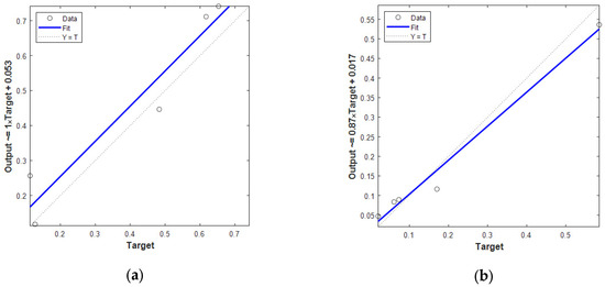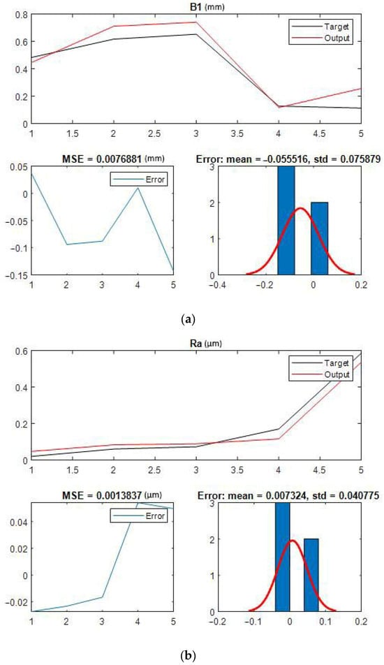 An ensemble learning regression algorithm generated a dataset of 54 entries to develop a prediction model. While a larger dataset would have allowed for more thorough training, validation, and testing, we were limited by complexity and cost constraints, thus restricting the number of tests we could run. Nevertheless, the 54 data points proved adequate for our modeling needs. We randomly allocated 90% of the data (49 entries) for training and validation, reserving the remaining 10% (5 entries) for testing. The data were randomly selected for model verification. This random selection method was applied to guarantee unbiased and valid model testing to ensure the reliability of the results. Furthermore, the dataset was split into training and validation subsets multiple times through random sampling to ensure no bias was introduced. This distribution enabled us to train the prediction model and assess its performance accurately and effectively. Following 54 experiments, we obtained the necessary dataset for each desired output (B1, B2, B4, B5, B8, Ra) and utilized it to test the prediction model. After training the model, we compared the results of unseen data prediction with the experimental values for these data to evaluate its performance. The resulting comparison chart for the Ra and B1 values can be observed in Figure 3. These graphs demonstrate the prediction model’s strong performance with unseen data. Additionally, a comparison of the regression analysis can be found in Figure 4. As space was limited, the remaining data’s prediction quality results are presented as performance metrics in Table 2.