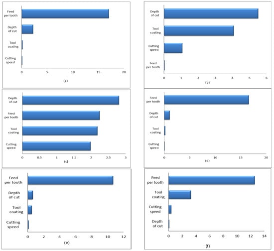 Each F-test aims to check if the response values, when grouped by predictor variables, come from populations with the same averages. On the other hand, the alternative idea is that the means of these groups are not the same. If the p-value related to the test statistic is low, it shows the significance of the predictor. The results are given as the negative log of the p-values, noted as log p. A higher score means the predictor variable is more important. Therefore, this measure helps understand the relevance of the variables [33]. According to the results of the F-test algorithm presented in Figure 5, the feed and depth parameters have a significant impact on B1. Similarly, the depth and coating parameters on B2, feed and depth parameters on B4, B5, and B8, and feed and coating parameters on Ra have a significant effect.