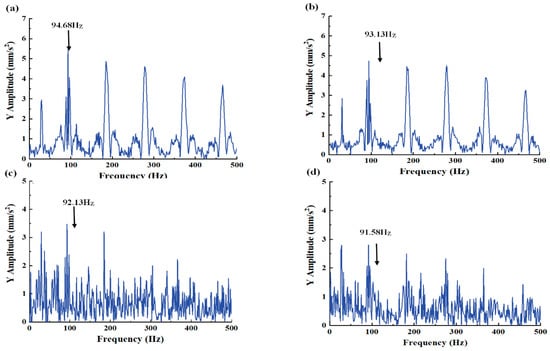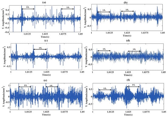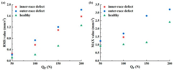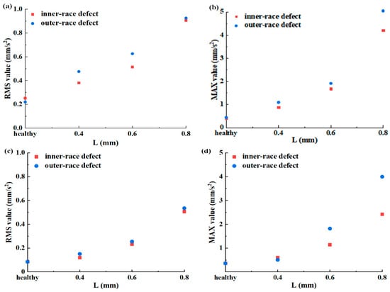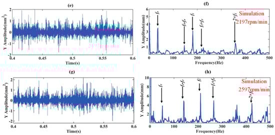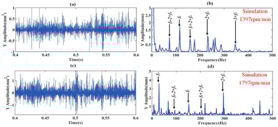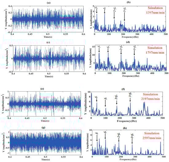 3.4. Effect of the Rotor Speed, Defect Position, Radial Load, and Defect Size on the Time- and Frequency-Domain Vertical Vibration Accelerations of FRBD with Lubrication Model