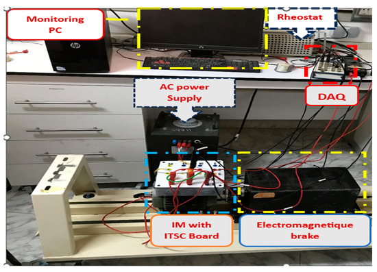 A controllable electromagnetic brake system provided the mechanical load, enabling tests under different load conditions. Real-time voltage and current measurements were acquired using an NI 6036-E Series data acquisition card at a sampling rate of 10 kHz. Figure 2 shows a general view of the experimental test bench.