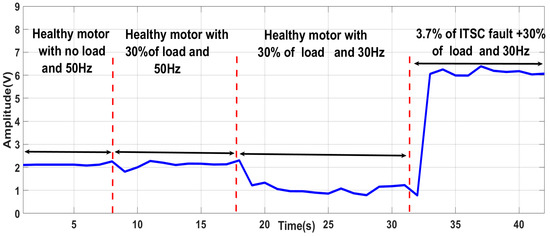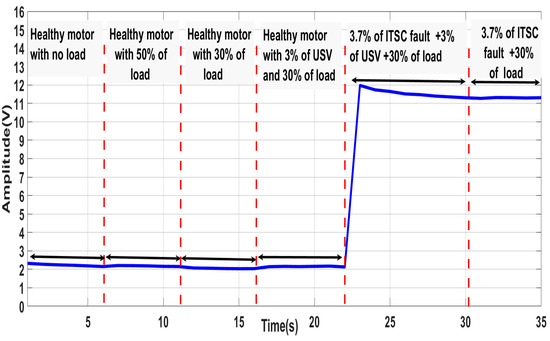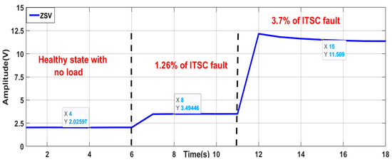 In this section, several tests are carried out in order to study the behavior of the two indicators under successive increases in the ITSC fault severity. First, the test was started with a motor under a balanced supply at no load. After a few seconds, ITSC faults with increasing severity are introduced. This is achieved by introducing ITSC faults affecting 1.26% and then 3.7% of the turns in phase ‘a’. Through these sequential tests, the studied indicators are computed and monitored in real time. The obtained curve is depicted in Figure 4 and Figure 5, whereas Table 2 shows the quantitative assessment of the studied indicators by measuring their amount of change as a function of the number of shorted turns. As it can be clearly seen, the studied indicators are stable and have small amplitudes during the motor operation in its healthy state (due to the motor’s inherent asymmetries). However, the successive occurrences of 1.26% and then 3.7% of the ITSC fault cause instantaneous responses on the studied indicators. Indeed, for the magnitude of harmonics, (fs − fr) = 25 Hz and (fs + fr) = 75 Hz, it is insensible to a low severity of the ITSC fault, and for 3.7% of the ITSC fault it has significantly increased from 0.0071 (A) to 0.025 (A) for (fs + fr) and then for (fs − fr) from 0.0115 (A) to 0.04 (A), which represents an increase of 252.11% and 247%, respectively. The second indicator (ZSV) has significantly increased from 2 (V) to 3.5 (V) and then to 11.5 (V), which represents an increase of 75% and 475%, respectively. This clearly demonstrates the tracking capability of the studied indicators as their amplitude raises each time the severity of the fault raises.