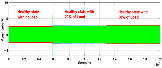 The previous tests were performed under no mechanical load. The data acquisition of the three-phase-to-neutral voltages and one-phase current started once the motor was operating healthily. A step load change was introduced after a few seconds. Motor load fluctuations are common and affect both motor currents and condition monitoring indicators. A reliable indicator must thus be insensitive to load changes. Additional tests included stepwise load variations to assess the indicators’ performance. Figure 6 illustrates how these step load changes significantly distort the motor current waveforms, producing non-stationary signals.