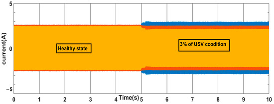The phase current evolution for an IM in a healthy state and with 3% of the USV condition.