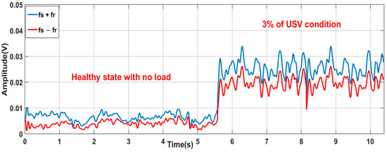 Figure 10 shows that a 3% USV condition significantly increased the magnitudes of the (fs − fr) and (fs + fr) harmonics in the stator current spectrum. These harmonics resemble those amplified by ITSC faults and load variations, differing only in amplitudes. This similarity in harmonic signatures makes an accurate fault diagnosis difficult using only a spectral analysis. Consequently, distinguishing an ITSC fault from a USV condition is problematic or impossible.