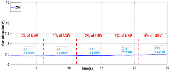 In addition, a series of experiments, progressively increasing USV conditions levels from a healthy operation up to 4% were conducted to evaluate the ZSV indicator’s behavior. The results, presented in Figure 12, show the ZSV’s robustness under these varying USV conditions, as it remained almost constant throughout the test period.