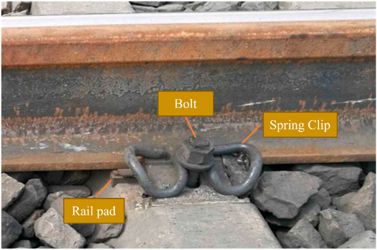 The fastener is primarily composed of three categories of components: the spring clip, the bolt, and the rail pad, and its functions are achieved through the coordination among these individual parts, as depicted in Figure 1. Under the long-term combined effects of cyclic train dynamic loads and complex and variable environmental loads, some typical damage and degradation issues have been exposed in fasteners currently in operation, e.g., fracture, missing and rotation of spring clips [4,5], protrusion and breakage of bolts [6,7], as well as aging and crushing of rail pads [8], etc. Such issues will lead to the attenuation or loss of fastening pressure and elastic support performance, thereby reducing the integrity and stability of the track structure, causing local damage or even overall failure of the track structure, ultimately deteriorating ride quality and endangering running safety. Therefore, the detection of the service condition of fasteners has always been a research focus.