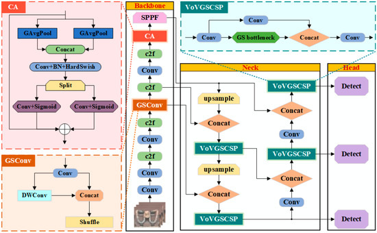 Firstly, in order to enhance the sensitivity of the model to subtle features of fastener images and its recognition ability under complex background interferences, the Coordinate Attention (CA) mechanism [26] is embedded between the c2f module and the SPPF module in the backbone structure, which enables the model to more effectively concentrate on key feature information of fastener images, thereby improving detection accuracy. Secondly, to reduce the computational cost while ensuring detection accuracy, the fourth traditional Conv block in the bottom-up direction of the backbone structure is replaced with a more efficient GSConv module [27], and the c2f module in the neck structure is upgraded to a VoVGSPCP module [27]. Lastly, to address potential issues of sample imbalance in the dataset and the subsequent decline in convergence during model training, the bounding loss function in the YOLOv8n model is optimized from Complete Intersection over Union (CIoU) [28] to Wise-IoU (WIoU) [29], thereby further enhancing the model’s training effectiveness and detection performance. The structure of the improved YOLOv8n-FDD model is presented in Figure 3.