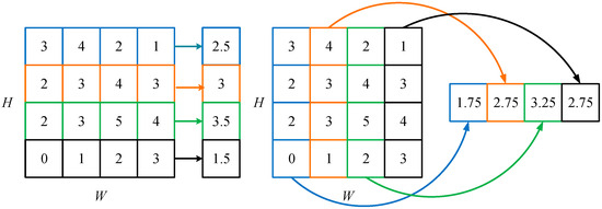 The process of average pooling along the height and width dimensions of the input feature map is depicted in Figure 5. Next, the obtained height feature map (H) and width feature map (W) are concatenated along the channel dimension, as shown in Figure 6. Meanwhile, a convolution operation with a kernel size of 1*1 is applied to the concatenated feature map to achieve dimensionality reduction, accordingly generating a new feature map . Then, the feature map is subjected to batch normalization (BN) [30] and passed through the nonlinear activation function Mish [31] to obtain a new feature map . The calculations for and are, respectively, shown in Equations (3) and (4).