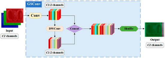 Notably, the GSConv module innovatively incorporates a shuffle operation, which mixes the information extracted by standard convolutions with the outputs of depth-wise convolutions, ensuring comprehensive information exchange and fusion, consequently improving the information processing capability and generalization performance of the entire module.