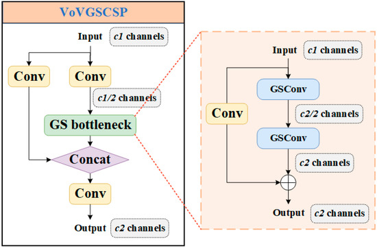 To further optimize the computational efficiency of the model, an improvement to the neck structure of the original YOLOv8n model is proposed in this paper. Concretely, the c2f module in the neck structure is substituted with the VoVGSPCP module, as shown in Figure 8. Considering the GSConv module, a bottleneck structure and skip connection are adopted in the VoVGSPCP module to construct the cross-stage network module, GS bottleneck [27], which effectively controls model complexity and significantly enhances training efficiency. The VoVGSPCP module, with its distinctive multi-path feature fusion mechanism and global information perception capability, not only preserves the richness and diversity of features, but also greatly simplifies the complexity of feature propagation, mitigating unnecessary computational resource consumption, thus improving the inference speed of the model.