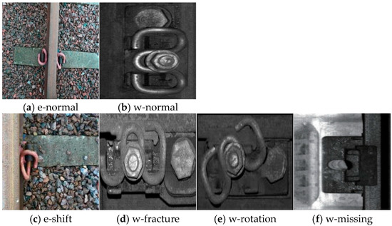 Given the challenges posed by environmental factors and the regulatory requirements of the railway department, acquiring a comprehensive fastener dataset is particularly difficult. In this paper, the fastener dataset is primarily acquired through two methods: field photography and online collection from relevant websites. By filtering the collected images and removing those that are blurry, backlit, or heavily obscured images, a final set of 714 images is organized to constitute the original dataset. The dataset comprises two types of normal fasteners and four types of defective fasteners, as shown in Figure 9. Among them, the normal types are labeled as: e-normal fastener and w-normal fastener; The defective types are labeled as: e-shift fastener, w-fracture fastener, w-rotation fastener, and w-missing fastener.