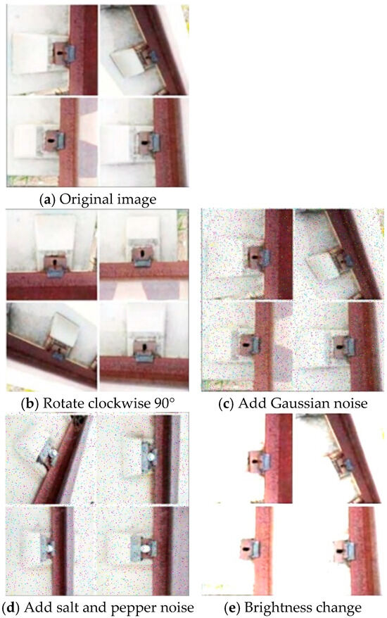 Owing to the position-sensitive characteristic of the fastener dataset, directly applying traditional data augmentation methods such as random scaling or random rotation may compromise key information in the images, consequently affecting the accuracy of model learning. Thus, more refined and targeted data augmentation methods are adopted in this paper to preprocess the original dataset, including clockwise 90° rotation, addition of Gaussian noise [35] and salt-and-pepper noise [36], as well as brightness variation [37]. The comparison of the effects before and after data augmentation is exhibited in Figure 10.