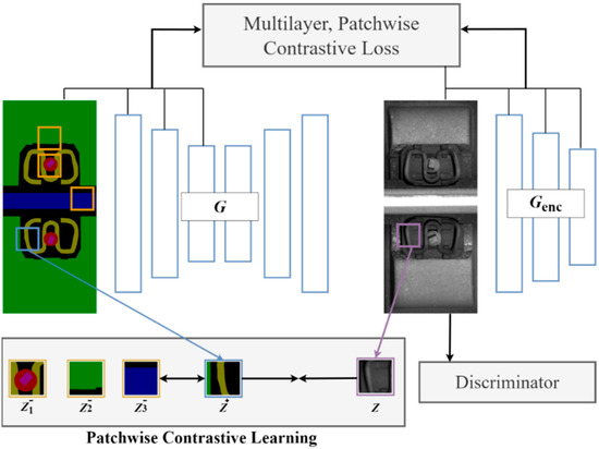 Style transfer refers to the process of transferring the visual style of an input image to a target image. Compared to traditional sample augmentation methods, data generation methods based on style transfer significantly alter the characteristics of the original image, enabling the generation of negative samples. Inspired by reference [38], masks of different defect types are performed in this paper by transferring the visual style of real images to masked images and subsequently modifying these masked images, thereby achieving diversified defect sample generation. Due to the scarcity of defect samples, it is difficult to form sufficient pairs of masked and real images as training data. Therefore, a style transfer model based on CUT (Contrastive Unpaid Translation, CUT) [39,40] is proposed in this paper.