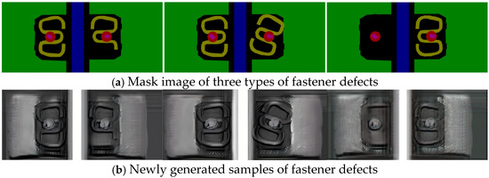 The CUT model, leveraging a contrastive learning mechanism, is capable of generating images that closely match the target image in both content and style without the need for paired training data. Figure 11 illustrates the process of fastener defect sample generation based on the CUT style transfer model. The specific steps are as follows: Firstly, the original image is converted into a masked image using the Labelme labeling tool. Next, different types of defects are simulated by adjusting the mask configuration of the fastener system. Finally, the modified masked image is input into the CUT style transfer model, which converts it into an image with a style similar to real fastener images while preserving the defect information introduced in the masked image.