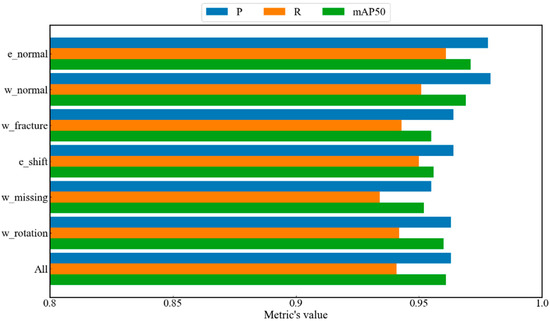 Figure 14 demonstrates the comparison of detection accuracy of the improved model, YOLOv8n-FDD, for different types of fastener defects on the test set. Firstly, it is evident that for the entire test set comprising samples from six fastener categories, the YOLOv8n-FDD model achieves 0.963, 0.941, and 0.961 in terms of P, R, and mAP, respectively. Furthermore, further observation reveals that for the normal categories, e-normal and w-normal, the P, R, and mAP values of the YOLOv8n-FDD model are slightly higher than the other four defect categories. Meanwhile, it is worth noting that the mAP values of the YOLOv8n-FDD model for each type of fastener reach more than 0.95, indicating that the YOLOv8n-FDD model fully meets the requirements for detecting fastener defects.
