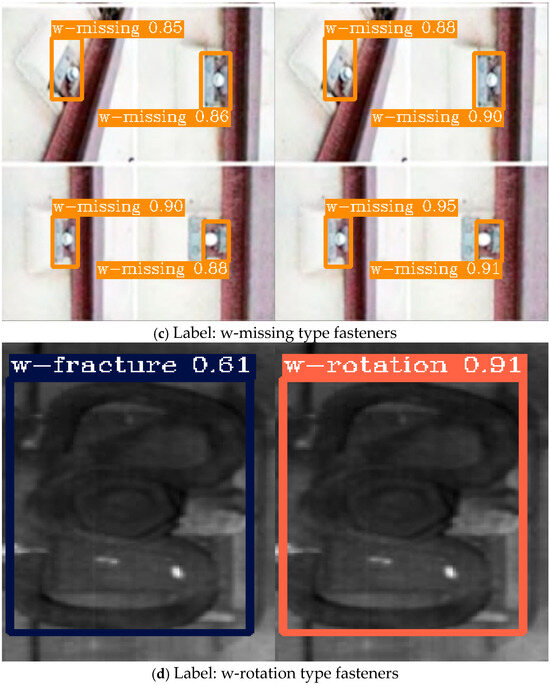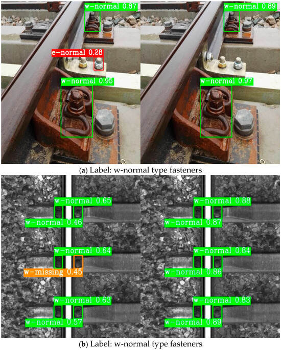 Specifically, it can be observed in Figure 15a that when detecting w-normal fasteners, the YOLOv8n model exhibits false detections, mistakenly identifying a bolt located outside the fastener position as an e-normal fastener. Similarly, in Figure 15b, the YOLOv8n model once again misclassifies a w-normal fastener as a w-missing fastener, revealing its limitations in distinguishing similar objects against complex backgrounds. In contrast, in Figure 15c, when detecting w-missing fasteners, both models are able to achieve accurate recognition and localization, but the YOLOv8n-FDD model outputs a higher confidence level, demonstrating its superior detection certainty and robustness. Lastly, in Figure 15d, when detecting a w-rotation fastener with rotated morphology, the YOLOv8n model again experiences a false detection, incorrectly identifying it as a w-fracture fastener. Conversely, the YOLOv8n-FDD model accurately recognizes the w-rotation fasteners, indicating its superior feature extraction and adaptability.