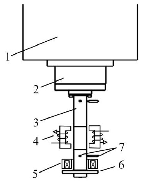 On-line magnetic non-contact excitation method and testing principle of electric spindle bearing. 1—electric spindle housing; 2—electric spindle; 3—test rod; 4—radial excitation structure; 5—axial excitation structure; 6—axial drive disk; 7—displacement sensor.