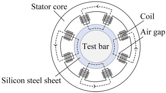 The radial magnetic excitation structure is shown in Figure 2. This structure mainly consists of test rods, silicon steel sheets, stator cores and coils wound around the stator cores, etc. The polarity of the magnetic poles is arranged in the shape of “-N-S-S-N-N-N-S-S-S-N-”, and the coils on two adjacent magnetic poles are connected in series to form magnetic pole pairs. When current enters the coil, magnetic pole pairs are formed. A closed magnetic circuit as shown in Figure 2 will be generated between the silicon steel sheet, the stator core and the air gap, thereby achieving the radial load excitation of the stator core on the test rod. The electromagnetic force of a closed magnetic circuit is determined based on the calibration relationship between the coil current and force, and its calculation formula is as follows: