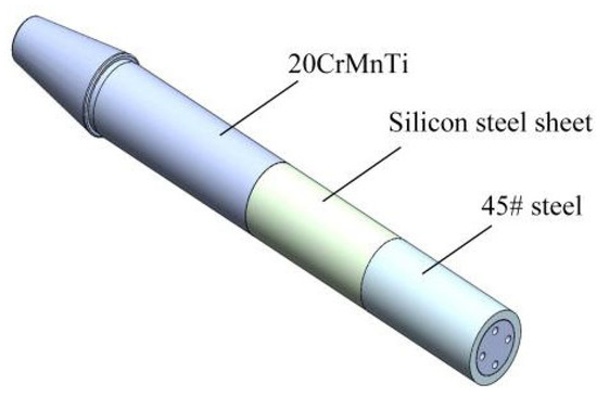The structure and material composition of the test rod are illustrated in Figure 3. The primary material of the test rod is 20CrMnTi magnetic steel. To enhance thrust density, load-bearing capacity and measurement accuracy while minimizing hysteresis and eddy current losses, 0.35 mm silicon steel sheets with high magnetic permeability and low iron loss are interference-fitted around the circumference of the test rod. Additionally, 45# steel is interference-fitted at the test rod’s end to serve as the measurement point for the electric spindle’s displacement response.