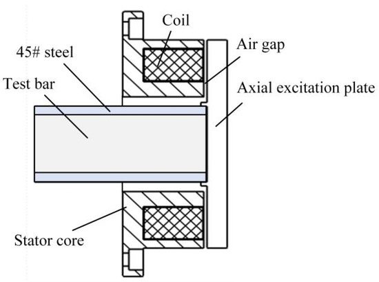 As shown in Figure 4, the axial magnetic excitation structure mainly consists of a test rod, stator core, coil wound on the stator core, axial excitation disc, etc. When the current is passed into the coil, a closed magnetic circuit will be generated between the test rod, stator core, axial excitation disc and the air gap, so as to realize the axial load excitation of the stator core to the axial excitation disc and then to the test rod.