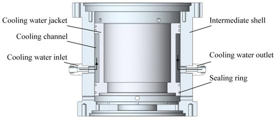 The radial and axial incentive cooling structure illustrated in Figure 5 primarily comprises an intermediate shell, a cooling water jacket, a locking gland and sealing rings. The cooling water jacket is sealed between the intermediate shell and the cooling water jacket to form a cooling channel, with sealing rings providing leakage prevention. The circulating cooling water enters this channel through the locking gland (Port No. 1) and exits via the locking gland (Port No. 2). This cooling system aims to mitigate the effects of stator core vortex heating and other thermal sources on testing accuracy, ensuring sustained stable operation of the magnetic excitation device over extended periods.