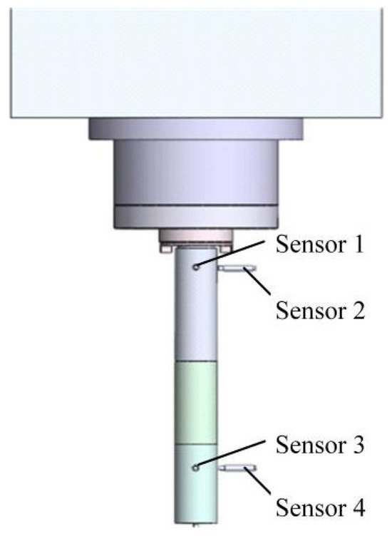 The installation position of the sensor on the test rod is shown in Figure 6. Sensor No. 1 and sensor No. 2 are arranged at 90°, consistent with the X direction and Y direction of the machine table, respectively, and are installed near the end face of the electric spindle. Sensor No. 3 and sensor No. 4 are also arranged at 90°, in the same X and Y directions as the machine table, and are installed near the end of the test rod.