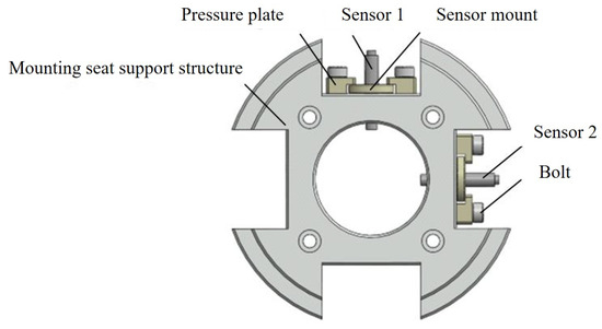 The support structure of the sensor, illustrated in Figure 7, primarily comprises a sensor mounting seat, pressure plate, bolts and the mounting seat’s supporting framework. The annular structure features an inner circumference coaxially aligned with the test rod and an outer circumference coaxially aligned with the testing device. Four radially distributed grooves, positioned at 90° intervals around the central axis, are designed to accommodate displacement sensors. During assembly, displacement sensors are first mounted onto the sensor mounting seat, after which the pressure plate is secured within the grooves using bolts, completing the installation sequence.