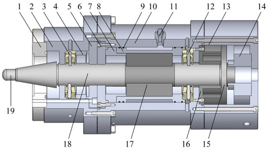 Structure diagram of magnetic non-contact excitation device. 1—Spindle body shaft end; 2—upper connecting body shell; 3—upper radial displacement detection module; 4—upper connector spacer ring; 5—the end cover of the connecting body housing; 6—intermediate shell end cover; 7—intermediate spacer ring; 8—water jacket; 9—sealing ring; 10—intermediate shell; 11—lock mother straight through; 12—lower radial displacement detection assembly; 13—lower connecting body housing; 14—hollow shaft incremental encoder; 15—axial drive disk; 16—axially excited stator core; 17—radial excitation stator core; 18—optimized test rod; 19—pull the nail.
