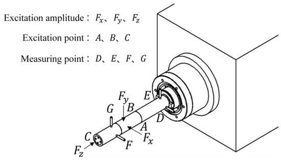 In order to test the stiffness of the electric spindle bearings under actual working conditions, it is necessary to apply load excitation to the electric spindle in the rotating state and measure the displacement response of the electric spindle. The load of the electric spindle tested in this paper is A slowly changing load, that is, the measurement method is quasi-static testing, as shown in Figure 11. The directions of the load excitation point and the measurement point are arranged along the three orthogonal directions of radial X/Y and axial Z, with their specific positions shown in Figure 11. Among them, point A and point B are radial load excitation points, and their excitation amplitudes are and . Point C is the axial load excitation point, and its excitation amplitude is . Select points D and E near the end face of the main shaft and points F and G near the end face of the test rod as the radial displacement measurement points.