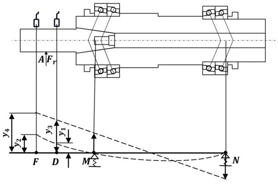 In the formula, and are the displacement response of point M and point N under the excitation of and , respectively, that is, the displacement amount of the front and rear support bearings, which can be obtained through the joint vertical Formulas (4) and (7). The supporting stiffness of the front and rear bearings of the electric spindle can be obtained by combining Formula (2).