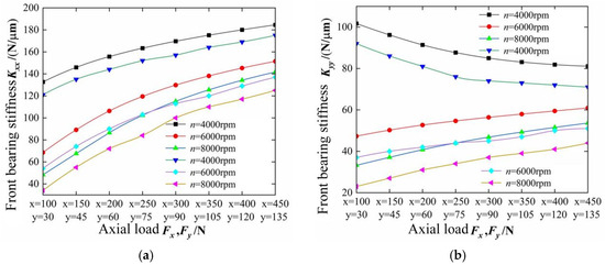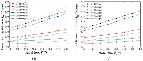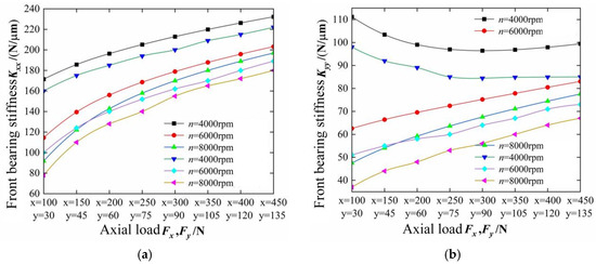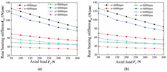 As shown in Figure 15 and Figure 16, under the condition of axial load , the radial load , and speed influence the supporting stiffness of the front bearing and rear bearing of the electric spindle, respectively.
