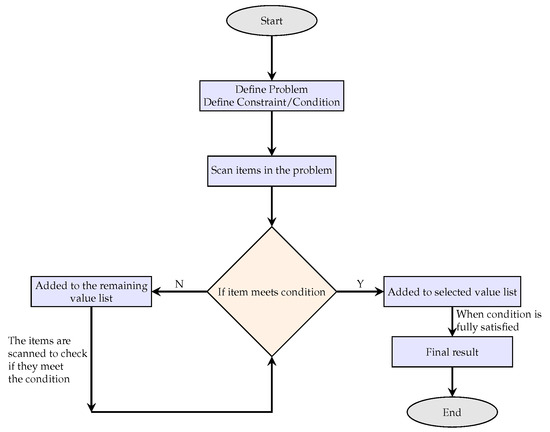 The Greedy Algorithm is an iterative approach used to solve optimization problems by making a sequence of locally optimal choices at each step, aiming to reach an optimal solution. This algorithm is particularly effective for problems where each local decision does not affect future decisions, making it efficient in terms of time complexity. Greedy algorithms have been commonly applied to problems such as minimum spanning trees, shortest paths, and scheduling [36]. For example, in the context of the Knapsack Problem, a greedy approach would involve selecting items based on the highest value-to-weight ratio until the knapsack reaches its capacity. A general illustration of the Greedy Algorithm is shown in Figure 1.