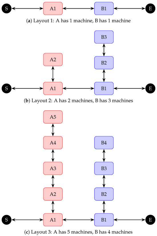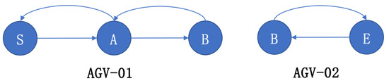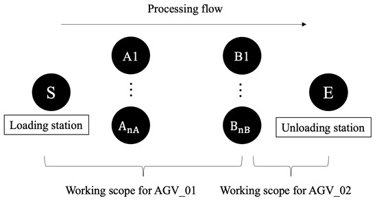 As shown in Figure 2, the simplified workshop scenario is divided into two distinct regions, each region being assigned an AGV for task scheduling. Region 1 comprises a loading station S, processing area A, and processing area B, while Region 2 comprises processing area B and an unloading station E.