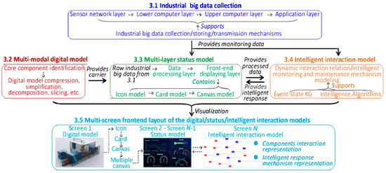 In this regard, a multi-modal/multi-layer DT modeling method is proposed. The method provides a systematic and step-by-step DT modeling guidance for general types of modeling objects. A kind of event-state knowledge graph (KG) is proposed and applied in the DT, and it is capable of modeling not only condition monitoring data but also the dynamic workflow and the operation mechanism of the modeling objects. In addition, the event-state KG can integrate artificial intelligence algorithm models to realize the capability of intelligent reaction during the remote monitoring and maintenance of the modeling objects.