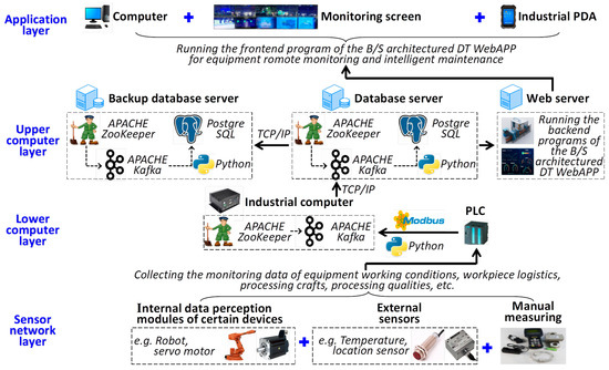 In this layer, a database server is for collecting/storing/managing the data from the industrial computer through TCP/IP protocols. APACHE Kafka and ZooKeeper should be installed on the database server for industrial big data processing, and database management tools such as PostgreSQL should be installed. The data would be sent to a Web server, which runs the back-end programs of the browser/server (B/S) architecture DT WebAPPs. In addition, a backup database server should be built for collecting and storing the data from the database server for data safety.