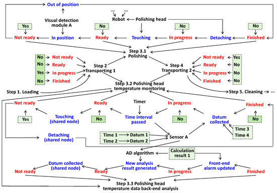 Assume that currently both Step 3.1 Polishing and Step 3.2 Polishing head temperature monitoring are in the state of In progress, and Step 4 Transporting 2 is in the state of Not ready. If the current states of Steps 3.1 and 3.2 have been updated to Finished The current state of Step 4 would be automatically updated to Ready Else The current state of Step 4 remains Not ready - The state-changing mechanism of a step node is triggered by the occurrence of an event. For example, in Figure 5, the links of Yes → Not ready → Step 3.1 Polishing indicate that Not ready is a possible state of Step 3.1 Polishing, and currently Not ready is activated, i.e., Step 3.1 Polishing is currently not ready. The links of No → Ready → Step 3.1 Polishing indicate that Ready is another possible state of Step 3.1 Polishing, and currently Ready is not activated. The links of Ready → In position → Not ready indicate that In position is the event that could trigger the state changing from Not ready to Ready for Step 3.1 Polishing, and the trigger mechanism can be realized with the pseudocode below.