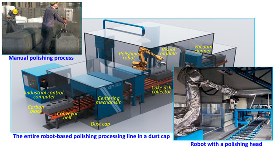 Here, a new kind of event-state KG is developed from our previous work [39,40] for providing an intelligent interaction model of the entire DT model. The event-state KG can represent the interaction relations and operation mechanisms among the components of the object equipment during its operation and maintenance. Specifically, the operation mechanisms for monitoring data collecting/storing/utilization, the monitoring data, and the time when the monitoring data were collected can be represented by the event-state KG. In addition, the event-state KG can encapsulate algorithm models (e.g., trained deep learning models, production rule models) in the KG as automatically running scripts of the event-state KG to enable automatic reacting mechanisms of the object equipment. By applying this kind of event-state KG as the back-end intelligent interaction model of the front-end digital/status models, the DT model can represent the complicated operation and maintenance mechanism of the object equipment. A kind of robot-based carbon block polishing processing line [41] is used as the modeling object of the event-state KG as an example in the rest of the paper.