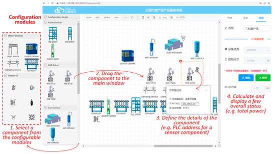 For the digital model of the DT, suitable components from the configurable modules (on the left side of the interface) were selected and dragged to the main window in the middle of the interface. The components dropped in the main window would be saved as components of the digital model of the processing line DT. The locations where the components were dropped were determined according to the real layout of the corresponding components of the processing line. Attribute input boxes would appear after dropping the components to define the device parameters, supplier information, price, etc., of the components.