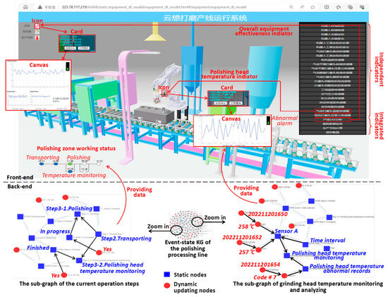 For the intelligent interaction model, the event-state KG represents the dynamic interaction relations among the processing line components, together with the data collecting/storing mechanisms of the sensor network. Based on predefined query algorithms, the current/historical operation status of the processing line can be fetched and displayed in the front-end interface of the DT. For example, the sub-graph of the current operation steps in Figure 8 indicates that currently, the processing line is at the step of Polishing, and this information is shown in the bottom left of the front-end interface. The event-state KG also represents the data collecting/storing mechanisms and the data collected and stored, as shown at the bottom right of Figure 8, where the polishing head temperature data were collected by Sensor A (i.e., the 257 °C and 258 °C). In addition, an anomaly detection algorithm model was embedded in the event-state KG for intelligently predicting whether the temperature is currently normal or not according to the already collected temperature data, and the prediction result was displayed in the Canvas of the Polishing head temperature indicator in the front-end interface (i.e., the Abnormal alarm in the top right of the Canvas).