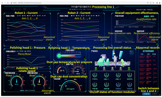 In this case, the object of the DT model was a two-robot processing line. The customer company did not require a digital model, but they required applying the canvas model for front-end visualization. They also required applying AD functions in the intelligent interaction model. In addition, the company asked for displaying certain information within one screen to provide a comprehensive and compact view of the most important indicators. In this regard, a split-screen DT was applied, and the entire screen was split into ten subareas, as illustrated in Figure 9 and introduced below.