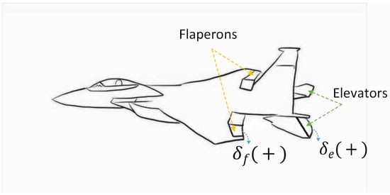 DLC can directly provide additional lift through the coordination of control surfaces without changing the flight attitude of the aircraft, enabling the aircraft to make a translational movement in the vertical direction to change its flight path. The direct lift discussed in this paper is generated by the co-directional deflection of the flaperons (), and the coordinated deflection of the elevator () is used to counteract the pitching moment generated by the normal deflection of the flaperons.