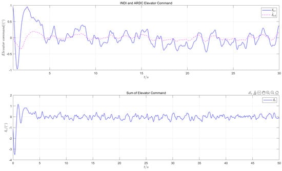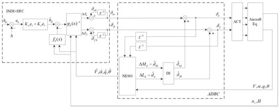 The longitudinal trajectory control of the receiver aircraft introduced in this paper refers to the altitude tracking and control of the receiver aircraft. The altitude control law of the receiver aircraft is the longitudinal control mode during autonomous aerial refueling docking, which is used to achieve the longitudinal tracking and control of the refueling drogue. On the one hand, this control law uses the INDI and DLC methods to generate the longitudinal control commands of the aircraft: the symmetric flaperon control command () and the elevator control command (). On the other hand, it uses an NESO to observe the disturbed state of the aircraft, as well as the disturbing forces and moments. The observed direct forces and moments are used as direct force compensation control to suppress disturbances, and the observed states are used as feedback signals for the INDI control. The altitude control law architecture of the receiver aircraft is mainly divided into two parts: the altitude control module based on INDI and DLC and the ADRC module based on the NESO (which is divided into the NESO module and the disturbance compensation module), as shown in Figure 2. The control objective of the receiver aircraft is to quickly track the given altitude command, such as the predicted drogue altitude.