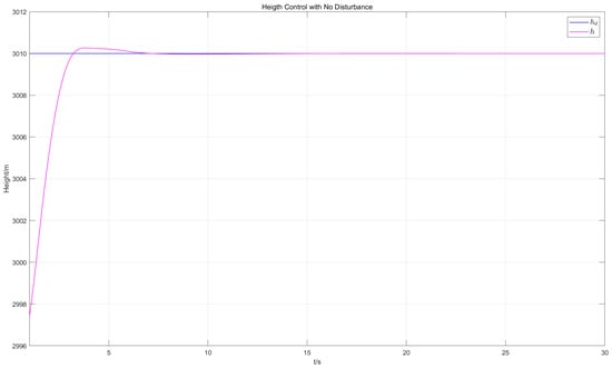 - Normal conditions: Initial height of m, initial velocity of 197.1 m/s, and target height of m, with no external disturbance, using the control method proposed in this paper.