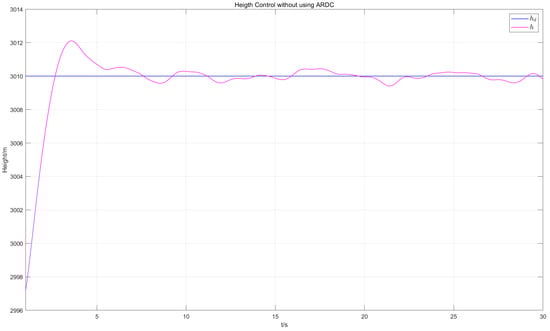 Figure 3 shows that under normal conditions, the altitude reaches the target value within 3 s, with an overshoot of no more than and almost no steady-state error. Figure 4 shows that when the method proposed in this paper is adopted, under disturbance conditions, the overshoot is no more than , the maximum deviation is 0.2 m, and the system recovers stability within 3 s through compensation by the observer, verifying the robustness of the control law. Figure 5 shows that without ADRC compensation, under disturbance conditions, the overshoot reaches and the maximum deviation reaches 0.4 m.