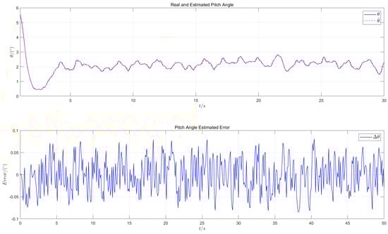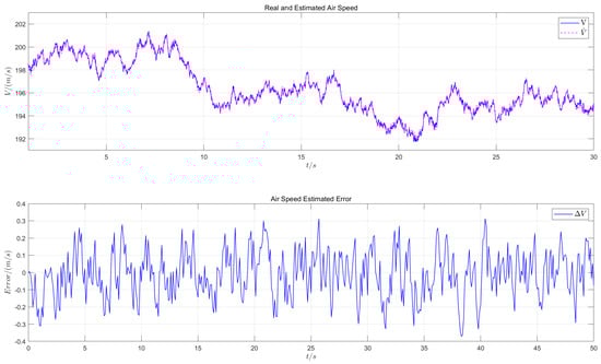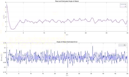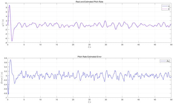 Figure 6, Figure 7, Figure 8 and Figure 9 show that under disturbance conditions, the estimation errors of the true airspeed, angle of attack, pitch angle, and pitch rate are less than 0.3 m/s, 0.12°, 0.1°, and 0.2°/s, respectively, indicating the high-precision estimation ability of the observer.