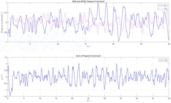 Figure 10 and Figure 11 illustrate that under disturbance conditions, the deflections of the control surfaces change smoothly. The maximum deflection of the flaperons is 1.5° (not exceeding the limit of ±10°), and the maximum deflection of the elevator is 3.5° (not exceeding the limit of ±20°). There is no high-frequency buffeting, meeting the safety constraints of the actuators, which demonstrates the engineering feasibility of the DLC strategy.