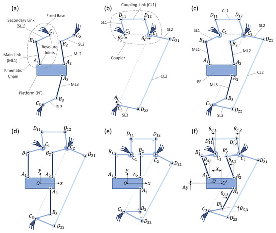 It is remarkable to note that, as long as singularities are avoided, the mechanism is isostatic, i.e., not under- or overconstrained. Indeed, when the couplers (Figure 1b) are attached to the 3-RRR planar parallel mechanism (Figure 1a), the platform mobility decreases from 3 DOF (all in-plane DOF) to 1 DOF in translation along (Figure 1c). Each coupler independently blocks 1 DOF of the platform as follows: CL1 prevents the in-plane rotation and CL2 limits the translation along . Advantageously, ML1, ML2, and ML3 extend perpendicular to the -axis when the platform is in a neutral position, which maximizes the in-plane support stiffness of the stage.