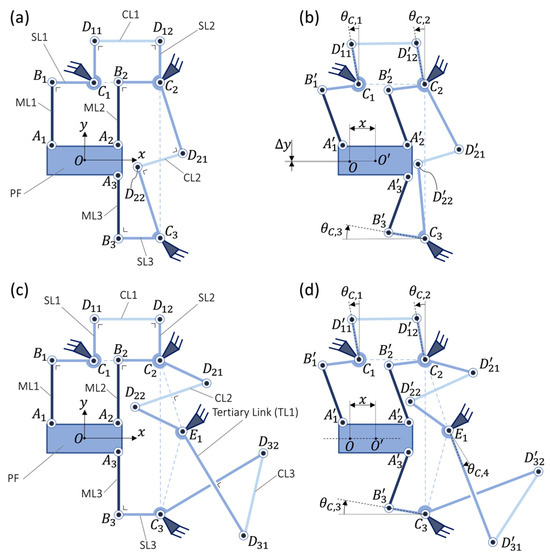 Hybrid TRIOSTAGES. Type I + II TRIOSTAGE: TRIOSTAGE based on parallelogram and Watt’s linkage couplers in (a) neutral and (b) deformed position. Type I + III TRIOSTAGE: TRIOSTAGE based on parallelogram and Kempe’s linkage couplers in (c) neutral and (d) deformed position.