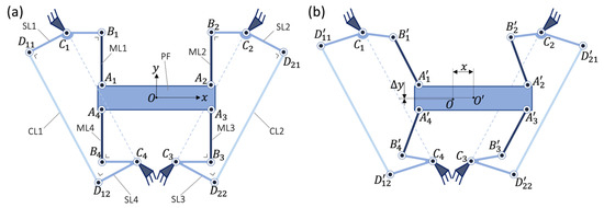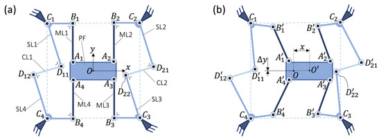 where is the length of the line segments and , and is the length of the line segments . This transmission defect leads to a lateral shift of the platform. If, in addition, Condition 4 is respected, this parasitic shift is minimized and of eighth order with respect to :